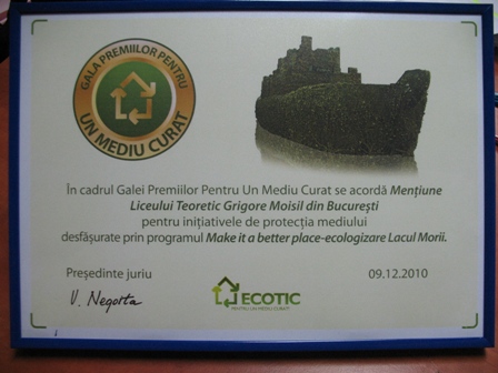 “Make It A Better Place” a primit Mentiune I in cadrul Galei din acest an, elevii si profesorii de la Liceul Teoretic “Grigore Moisil” din Bucuresti obtinand aceasta performanta dupa ce in primavara acestui an au demarat programul de ecologizare al Lacului Morii din capitala. Aproximativ 300 de voluntari au igienizat imprejurimile Lacului Morii si au plantat copaci in zona dintre lac si Parcul Crangasi. Peste 12 tone de deseuri au fost colectate in timpul acestei actiuni.