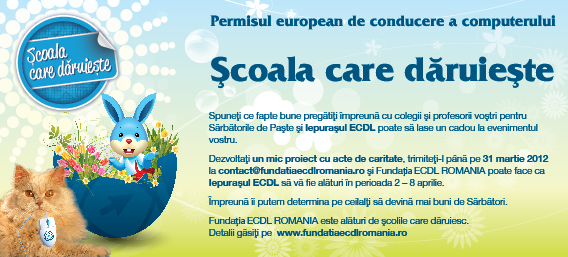 In perioada 16 – 30 martie 2012, Fundatia ECDL ROMANIA invita toti elevii si profesorii sa se inscrie in campania „Scoala care daruieste”. Elevii si profesorii din intreaga tara, care intentioneaza sa desfasoare proiecte cu acte de caritate in perioada Sarbatorilor de Paste de anul acesta, le pot inscrie pe adresa contact@fundatiaecdlromania.ro  pana la data de 30 martie 2012 inclusiv si Fundatia ECDL ROMANIA poate face ca Iepursul ECDL sa le fie alaturi. Regulamentul complet al campaniei poate fi accesat pe www.fundatiaecdlromania.ro  .